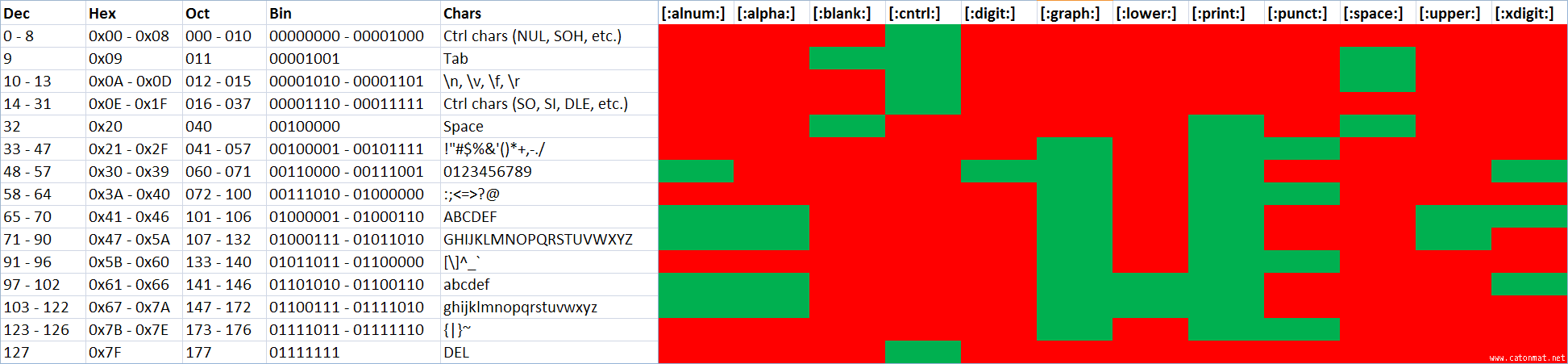 | Visualization of Regular Expression Character Classes Posted: 25 Feb 2013 11:28 AM PST We all know the regular expression character classes, right? There are 12 standard classes: [:alnum:] [:digit:] [:punct:] [:alpha:] [:graph:] [:space:] [:blank:] [:lower:] [:upper:] [:cntrl:] [:print:] [:xdigit:] But have you seen a visual representation of what these classes match? Probably not. Therefore I created a visualization that illustrates which part of the ASCII set each character class matches. Call it a cheat sheet if you like: A bunch of programs that I usedJust for my own reference, in case I ever need them again, here are the one-liners I used to create this cheat sheet: perl -nle 'printf "%08b - %08b\n", map { hex "0x".(split / /)[0], hex "0x".(split / /)[1] } $_ ' perl -nle 'printf "%03o - %03o\n", map { (split / /)[0], (split / /)[1] } $_' And I used this perl program to generate and check the red/green matches: use warnings; use strict; my $red = "\e[31m"; my $green = "\e[32m"; my $clear = "\e[0m"; my ($start, $end) = @ARGV; die 'start or end not given' unless defined $start && defined $end; my @classes = qw/alnum alpha blank cntrl digit graph lower print punct space upper xdigit/; for (map { chr } $start..$end) { for my $class (@classes) { print "${green}1${clear}" if /[[:$class:]]/; print "${red}0${clear}" unless /[[:$class:]]/; } print "\n" } CreditsI was inspired to create this visualization when I saw a similar table for C's ctype.h character classification functions. |