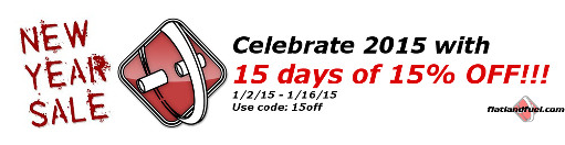 Happy New Year from Flatlandfuel! We are celebrating 2015 with 15 days of 15% off! You wont get a better deal until next Thanksgiving so don't miss out. Use code 15off at checkout. Sale ends January 16th!