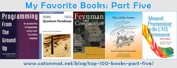 I also just started a GitHub repository the-little-prover that contains all code examples from the book (just like I did for all previous books in the series.) Author: Daniel P. Friedman and Carl Eastlund. Illustrations by Duane Bibby. #25 Advanced Programming in the UNIX Environment (APUE) (3rd Ed)Sir. Richard. Stevens. Himself. Do I need to say more? I've all his books and almost all of them are in top 100. I also have all three editions of this book. This book is a classic. As long as there will be Unix (forever), there will be this book. Of course I haven't read it all but I've consulted it hundreds of times. This is the definitive reference book for every serious and professional UNIX systems programmer. Every concept is explained clearly, there are thousands of code examples, hundreds of illustrations and graphics that show how various concepts relate. I don't know what else to say. Get this book if you want to live. Extra tip: The book contains a rich set of examples and downloadable code that is very useful. Here's the link to source code from the book: http://www.apuebook.com/code3e.html.