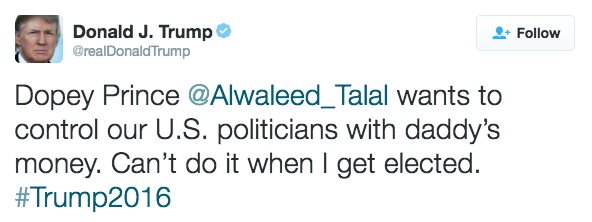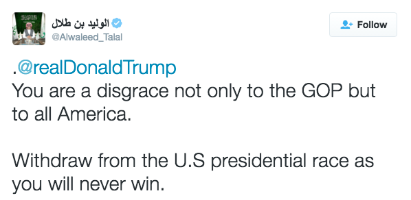Profit From Trump's Plan to Destroy Saudi Arabia's Petroleum Monopoly... Take a look at what Prince Alwaleed Talal had to say about Donald Trump on Twitter... And here's what Trump had to say about the Prince... Now, this lively exchange occurred back in December. No doubt the Saudi billionaire is alarmed now. In fact, the entire Saudi ruling family should be terrified about what could soon happen to its petroleum monopoly. Trump has publicly stated America is "the Saudi Arabia times 100 of natural gas, but we don't use it [because of government intervention]." And we think if Trump becomes president, he could have big plans to end U.S. dependence on Saudi petroleum once and for all with a swipe of the pen. And we think this astonishing development about to hit the transportation market could be at the center of it all. There's one little-known company in the Louisiana Bayou that could make billions producing gasoline WITHOUT petroleum. We believe this stock could hand you triple-digit gains... potentially even a 633.5% gain over a few years... And we expect much, much more under a Trump presidency. Get the incredible story here... (Get this breaking story now... before the story becomes part of the election cycle and this little-known stock rockets.) Sincerely, Sean |