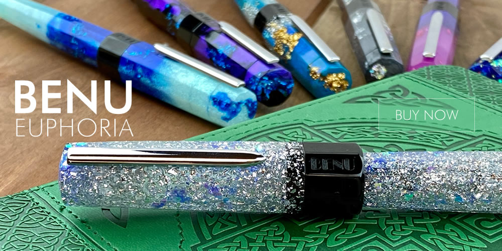 The Benu Euphoria Collection fountain pens are completely stunning. The collection includes 11 different color options, with three "glow in the dark" pens. All Benu Euphoria fountain pens feature a gorgeous resin body design, a postable cap, and the popular Benu style that inspires so many pen enthusiasts to crave the latest from this Russian pen manufacturer.