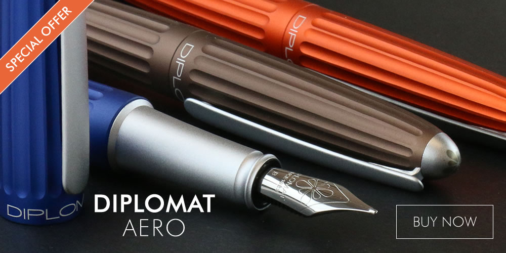 Save on the Diplomat Aero fountain pens. Feel the legacy of the Zeppelin in the design with the pens smooth lines and a streamlined body. Made from full aluminum casting that is anodized and matte chrome fittings. The body has groove-like depressions on both the cap and the barrel. Finished with a stainless steel nib, the pen has a soft sliding click cap design.