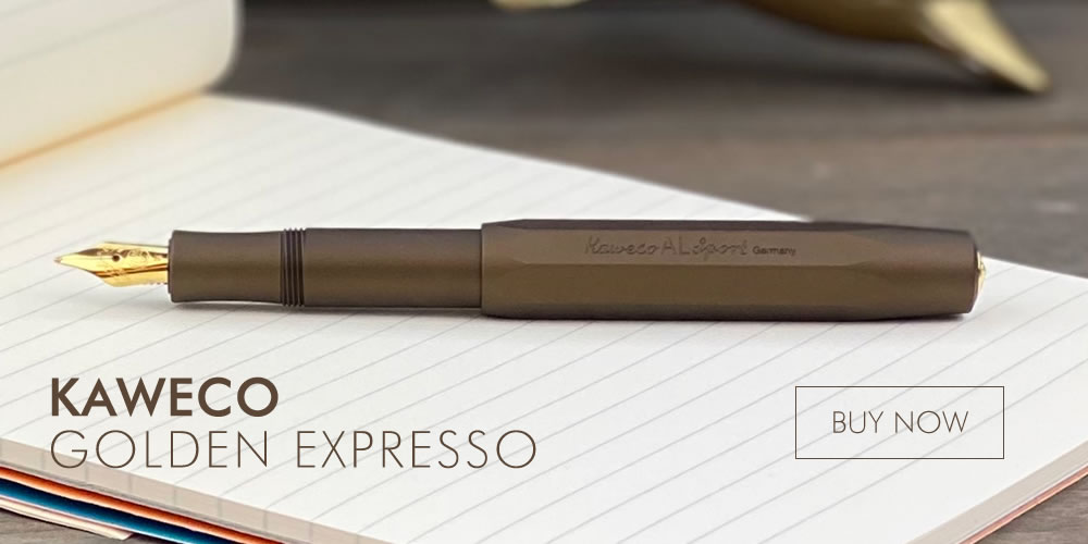 The special edition Kaweco AL Sport Golden Espresso fountain pen has been fitted with a gold stainless steel nib and includes gold branding on the cap medallion. Limited to only 700 pieces.