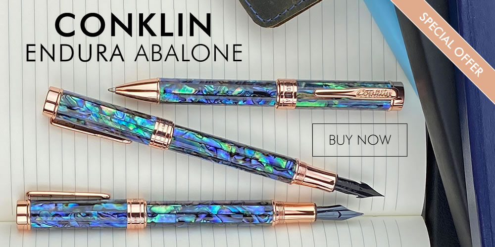 Save today on the Conklin Endura Limited Edition fountain pen. Made from real seashells and finished with a rose gold trim. Fitted with a #6 JOWO stainless steel nib, only 1898 pieces of the Endura Abalone Rose Gold were made.