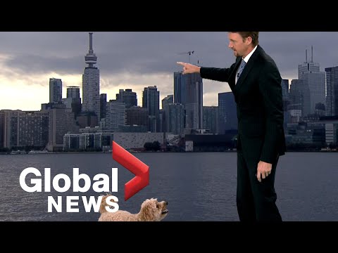 Storm the dog is interested in both the weather and treats. He strolled across the set while Anthony Farnell of Global News reported on the weather in the Toronto area. Farnell kept on this game, though. Don't be alarmed by the seemingly low temperatures. The broadcast is using Celsius, not Freedom Units. 20°C is quite comfortable. -via Amanda Brennan |