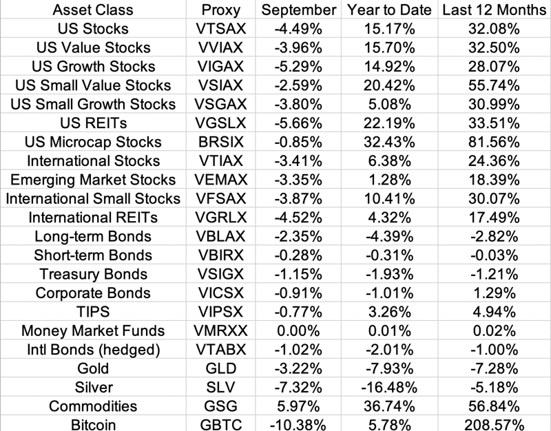 Well, that was a lousy month to be an investor. Almost everything was down: stocks, bonds, real estate, precious metals, and cryptocurrency. Commodities were the one shining light and have the best performance year to date. Bonds are mostly into negative territory already this year. Small value tilts are paying off this year, at least on the domestic side. Still some impressive numbers over the last 12 months.
