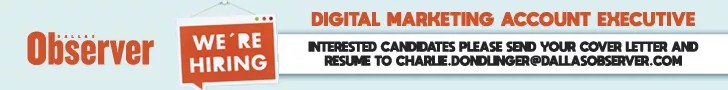 Change My Info | Unsubscribe To ensure you receive our emails, please add inbox@dallasobserver-insider.com to your address book. You are receiving this advertisement newsletter because you have signed up on our website or at an event, participated in a promotion, or purchased a ticket to an event. Thank you for your patronage. © 2021 Dallas Observer, LP. All rights reserved. 2030 Main Street, Ste. 410 Dallas, TX 75201 |