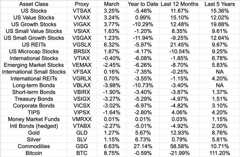 Stocks had a good solid month, but are still down year to date. The "small value comeback" seems to have at least taken a month off. Real estate had a great month too, not sure why with interest rates being raised, but perhaps it is mostly due to fear of inflation. The big news this month was that bonds had a terrible month. When interest rates go up, the value of current bonds go down, but the yield on both current and new bonds goes up, increasing expected future returns. Keep in mind, of course, that "terrible" is only down 3% when it comes to bonds. They're not that volatile. Speaking of volatile, guess what is almost back to even on the year? That's right, Bitcoin. Huge turn around this last week. Commodities are also way up this month. I'm sure it has nothing to do with oil being $110 a barrel. The general trend for the first quarter seems to be that stuff that does well in inflationary scenarios (stocks, real estate, precious metals, commodities etc) tended to do okay to pretty well and stuff that doesn't (i.e. long bonds) got creamed.