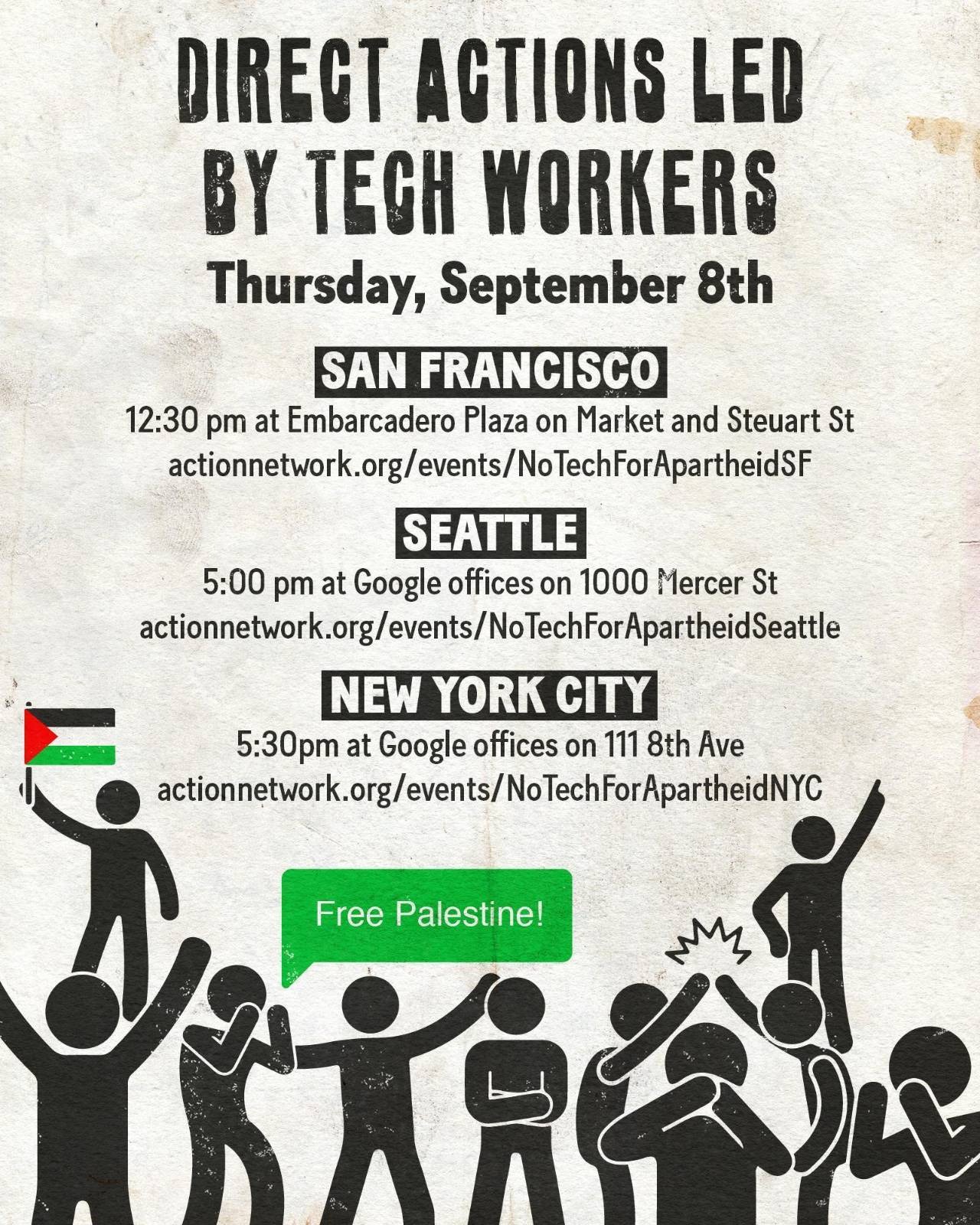 That's why, next week, we're turning up the pressure in solidarity with tech workers by holding direct actions at Google and Amazon offices across the country to demand they stop doing business with apartheid and cut their $1.2B contract with the Israeli government and military.