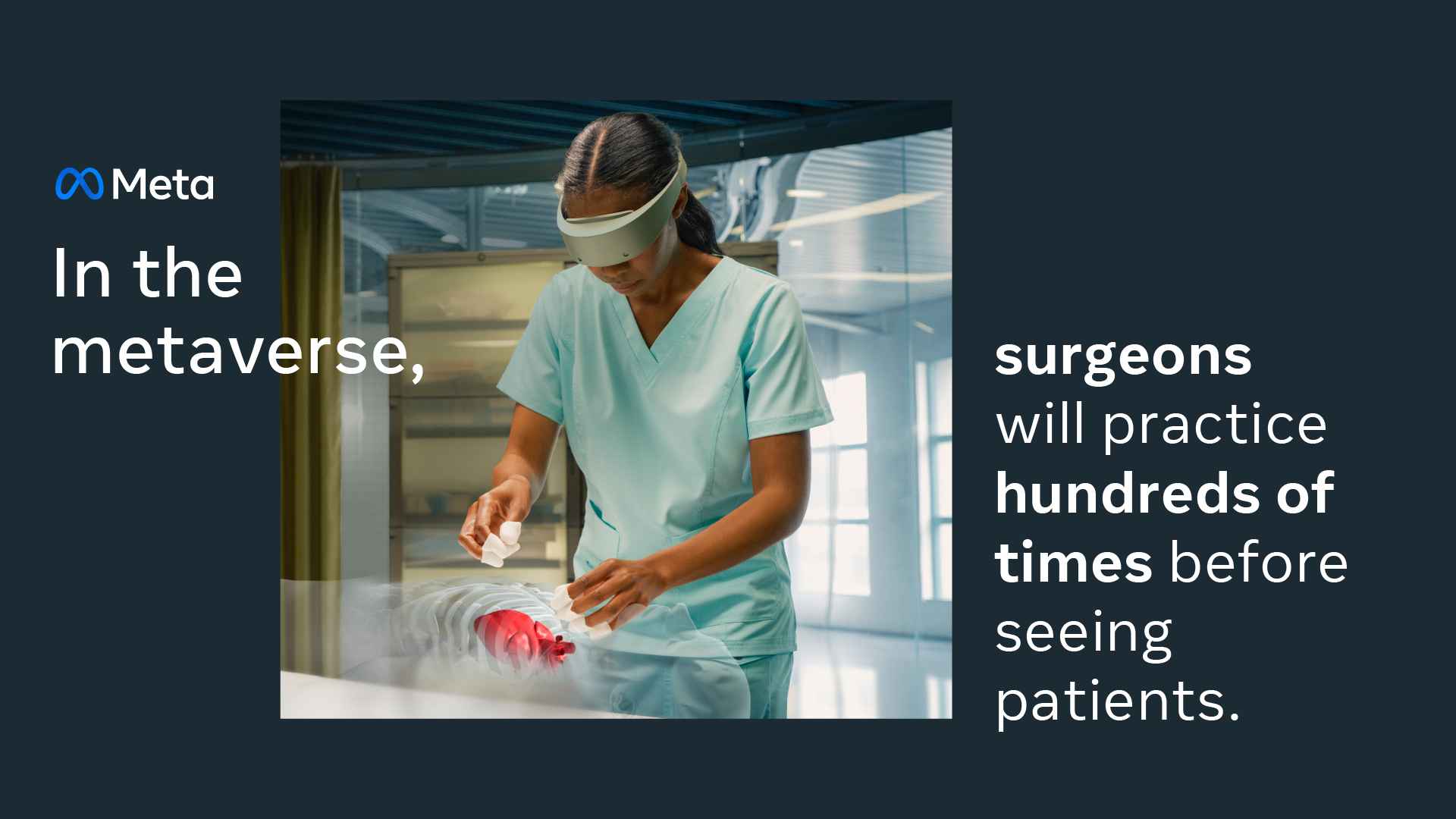 | Surgeons will engage in countless hours of additional low-risk practice in the metaverse. The impact: Patients undergoing complex care will know their doctors are as prepared as possible. The metaverse may be virtual, but the impact will be real. See how Meta is helping build the metaverse. |