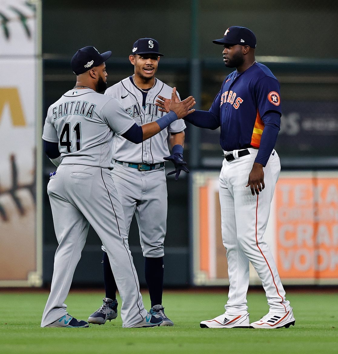 | | | | | | | 5. ⚾ Afro-Latinos' baseball dominance | | The Seattle Mariners' Carlos Santana and Julio Rodríguez greet the Houston Astros' Yordan Álvarez before an ALDS playoff game Oct. 13 in Houston. Photo: Bob Levey/Getty Images Major League Baseball is looking less like Jackie Robinson — and more like Roberto Clemente, Axios' Keldy Ortiz and Russell Contreras write. - The World Series, which began last night (Phillies 6, Astros 5) is expected to have zero non-Hispanic Black American players for the first time in 72 years.