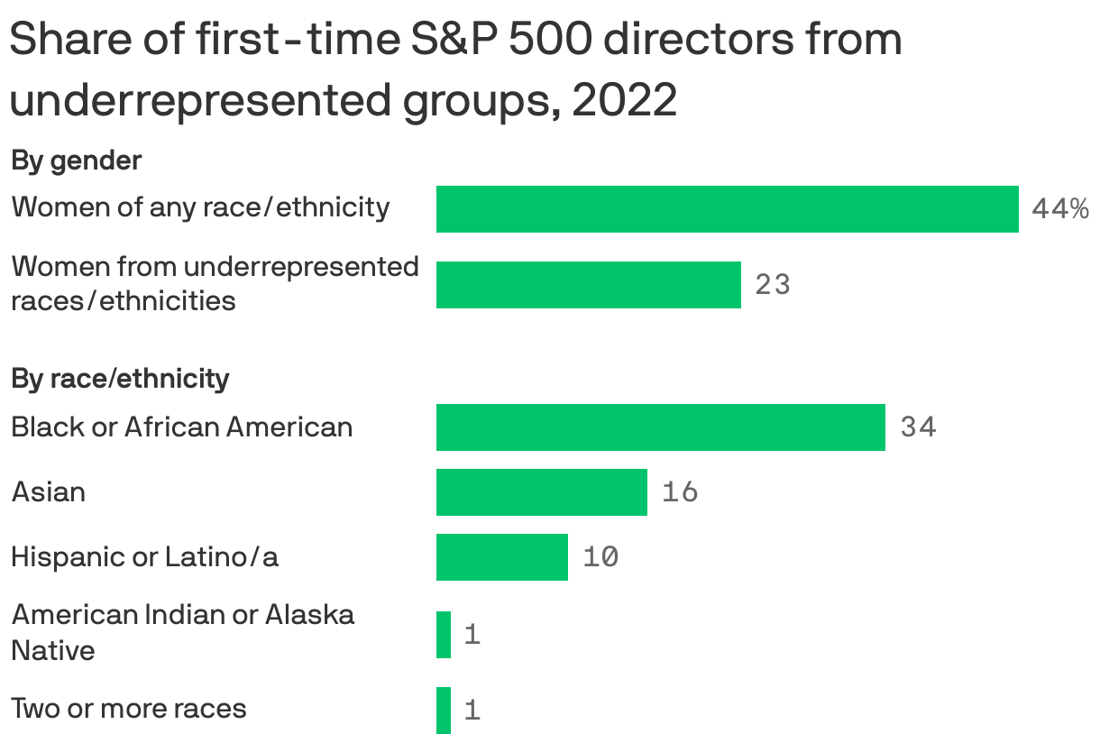 In other words: Yes, the next rate hike in December might be 0.5 percentage points instead of 0.75 points. But higher borrowing costs are here to stay. | | | | | | | 2. Charted: S&P 500 milestone |  Data: Spencer Stuart; Chart: Erin Davis/Axios Visuals Nearly one-third of all board directors among S&P 500 companies are women, Hope writes. - Women now represent 32% of all S&P 500 directors — the most ever.