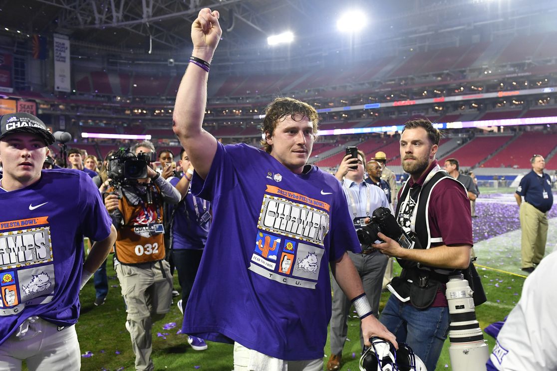 TCU quarterback Max Duggan makes the "Go Frogs!" hand sign after winning the Fiesta Bowl in Glendale, Ariz., yesterday. Photo: Alika Jenner/Getty Images It was the best semifinal day in the nine-year history of the College Football Playoff: - The title game (SoFi Stadium in L.A. on Jan. 9) will match the defending national champion against the closest thing the sport has had in years to a Cinderella, AP's Ralph D. Russo writes.