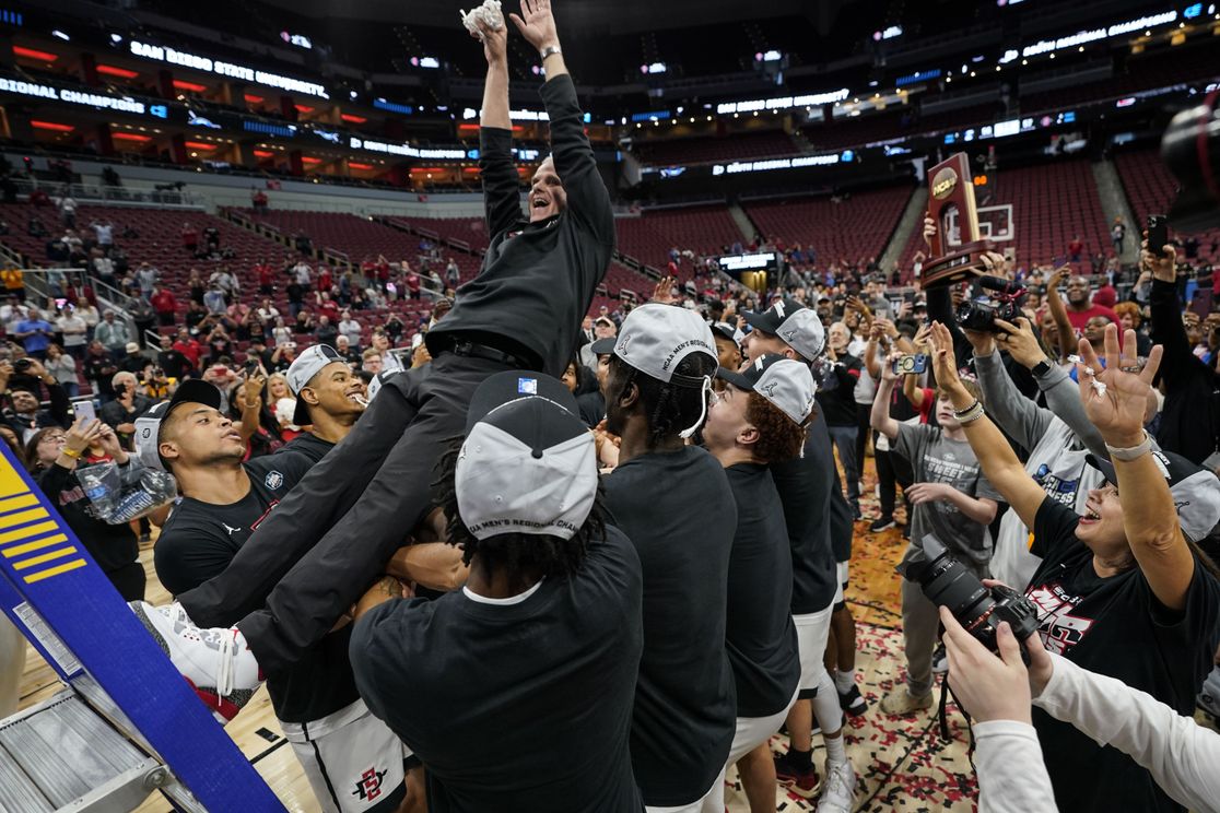 By the numbers: This will be the second-highest seed combination in Final Four history. UConn (4), Miami (5), San Diego State (5) and FAU (9) add up to 23 — eclipsed only by UConn (3), Kentucky (4), Butler (8) and VCU (11) in 2011. San Diego State head coach Brian Dutcher cuts down the net, then falls into the arms of his team after winning the school's first Final Four spot. Photo: Mike Stewart/AP Lots of firsts: - First time since 1970 that there are three first-time participants. UConn is the only one that's been here before.