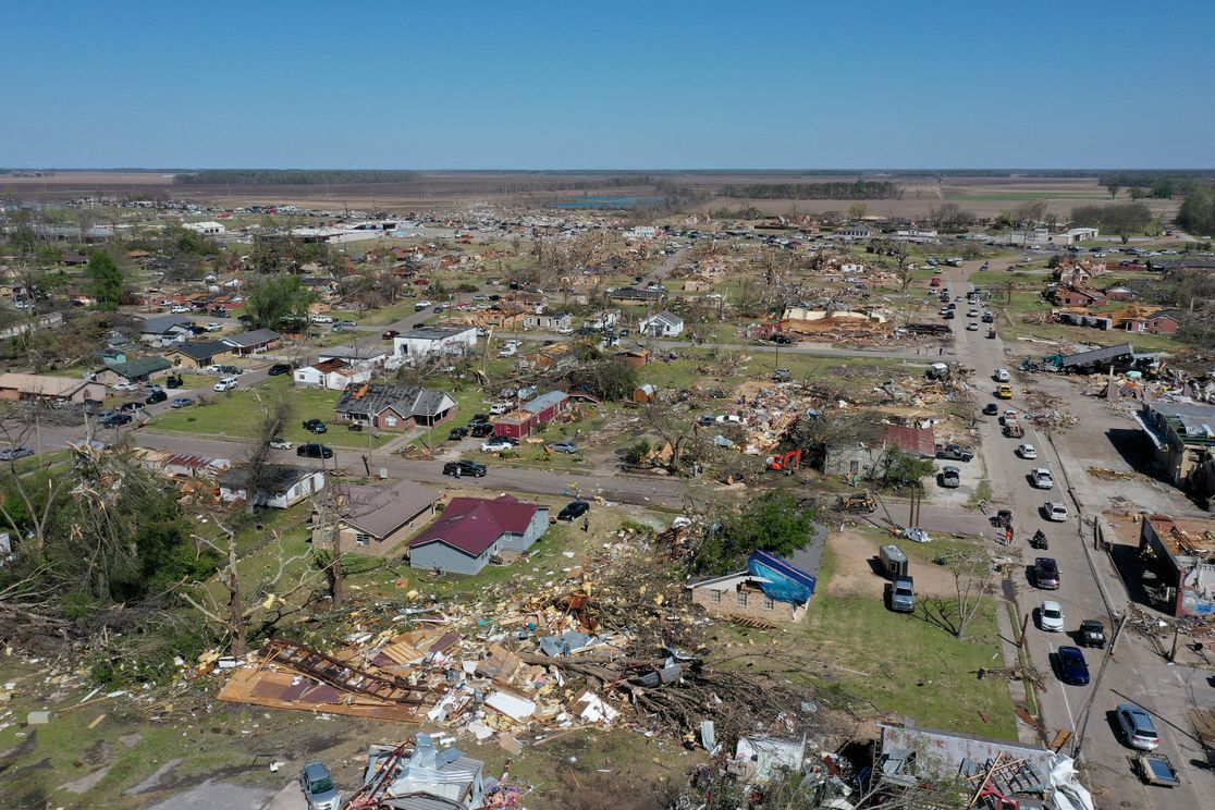 President Biden declared a disaster in Mississippi, opening up federal funding. A pickup rests atop a restaurant cooler at Chuck's Dairy Bar in Rolling Fork, Miss. Photo: Rogelio V. Solis/AP The tornado devastated a swath of the 2,000-person town of Rolling Fork, Miss. (above), reducing homes to piles of rubble and flipping cars. A drone's-eye view of Rolling Fork, Miss. Photo: Will Newton/Getty Images The National Weather Service said the tornado was given a preliminary rating of EF-4 — the second highest. - The weather service warned of a risk of more severe weather today — including high winds, large hail and possible tornadoes in Louisiana, Mississippi, Alabama and Georgia.