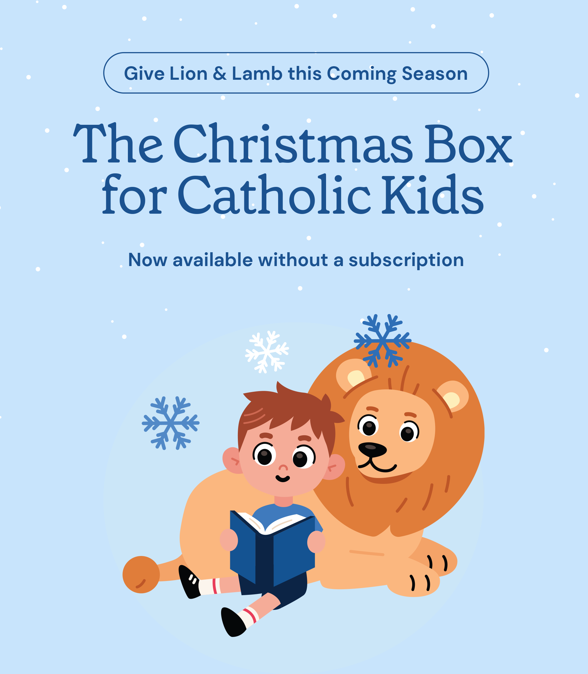 Now Available without a Subscription for Christmas If you are wondering what to get your child, godchild, grandchild, niece or nephew this Christmas season, we're happy to announce the most popular Catholic book club for kids is now available without a subscription. The Lion and Lamb Christmas box includes a great selection of fun and faithful books tied to the season, Tiny Saints, stickers and more. Each year it seems increasingly more difficult to balance the joy of gift giving with the overcommercialization of Christmas - particularly if you are a parent or grandparent of young children. There are few things better than the smile of little ones as they open something they love - and few things more rewarding than finding the perfect gift that gets them excited about our faith. This beautifully curated box of children's books and fun surprises will help you strike that balance perfectly. These boxes will only be available without a subscription for a short time. Order your Christmas box today and help the children in your life embark upon a Christmas journey into their imaginations and their faith. God bless you, The Catholic.Store Team |