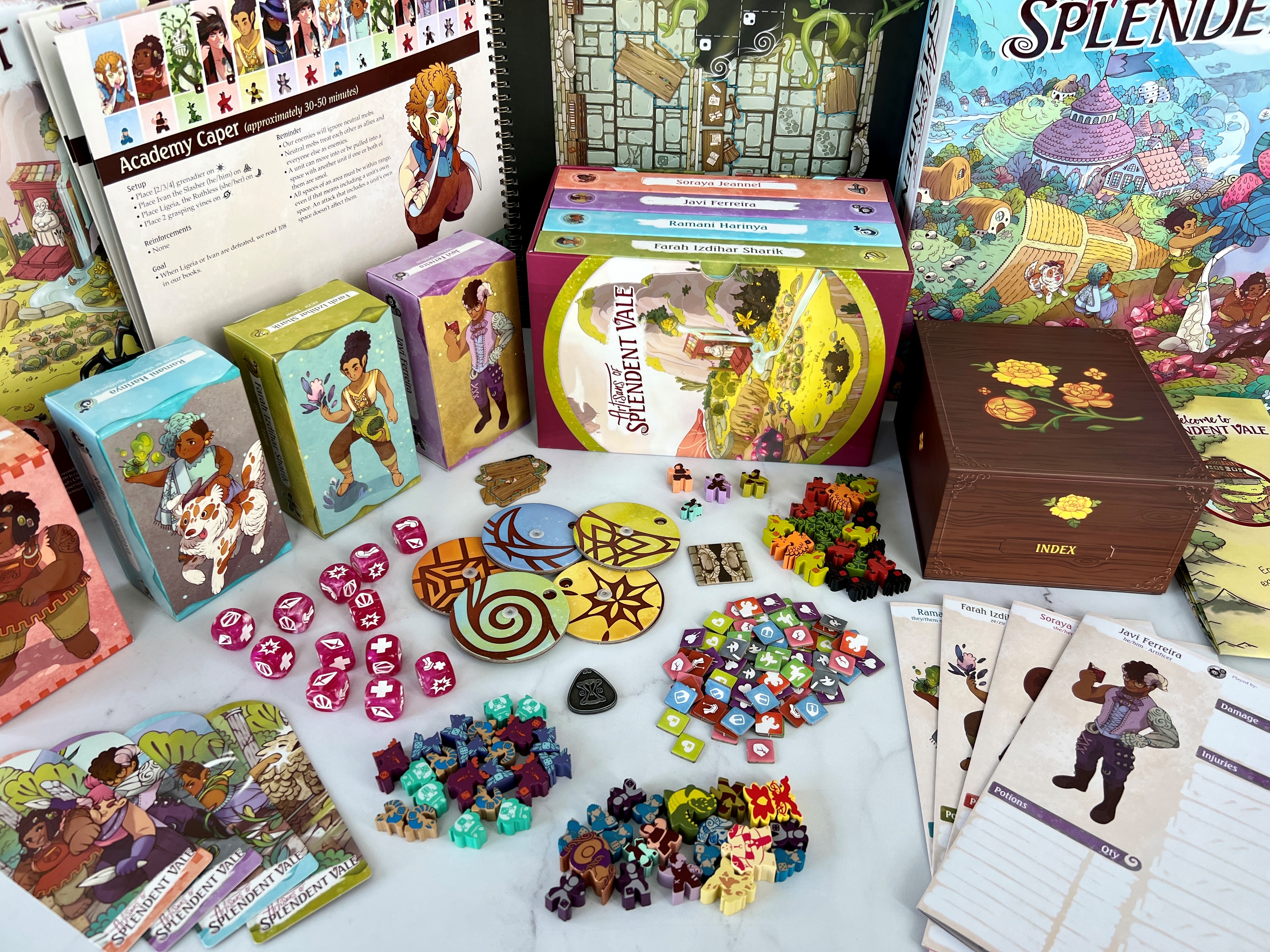 | | Artisans of Splendent Vale | | Artisans of Splendent Vale is a cooperative adventure game set in a magical and unique land. As a troupe of artisans, you will explore the beauty of the Splendent Vale while honing your individual crafts. Overcome challenges during tactical action scenes played out on specialized grid maps. Teamwork and careful strategy will be crucial during these encounters. | | At a Glance: - Ages: 14+
