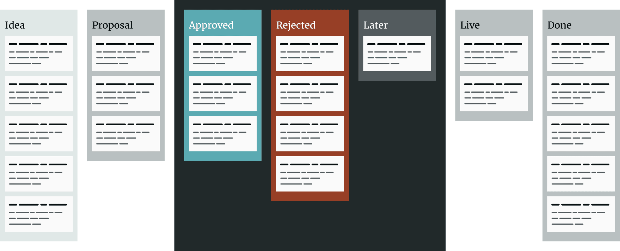 I favor creating a simple set of steps that any idea passes through, which I organize into a Kanban board.