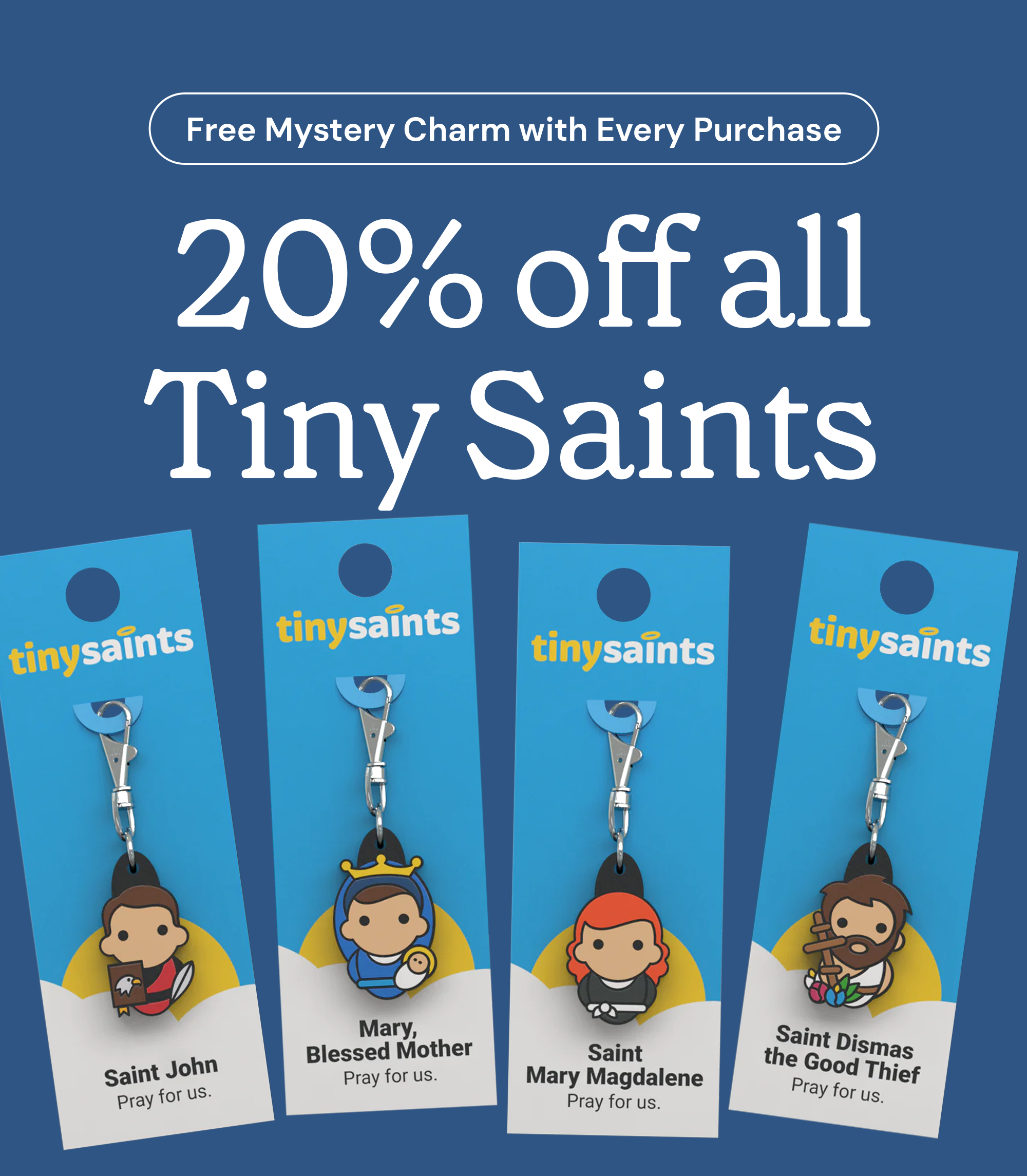 Don’t forget your free Tiny Saint! As our Easter gift to our subscribers, we’re giving away a free Mystery Tiny Saint with the purchase of any Tiny Saint charm. Let the mystery saint become a special companion from Heaven to journey with you this coming Easter season and the rest of the year.