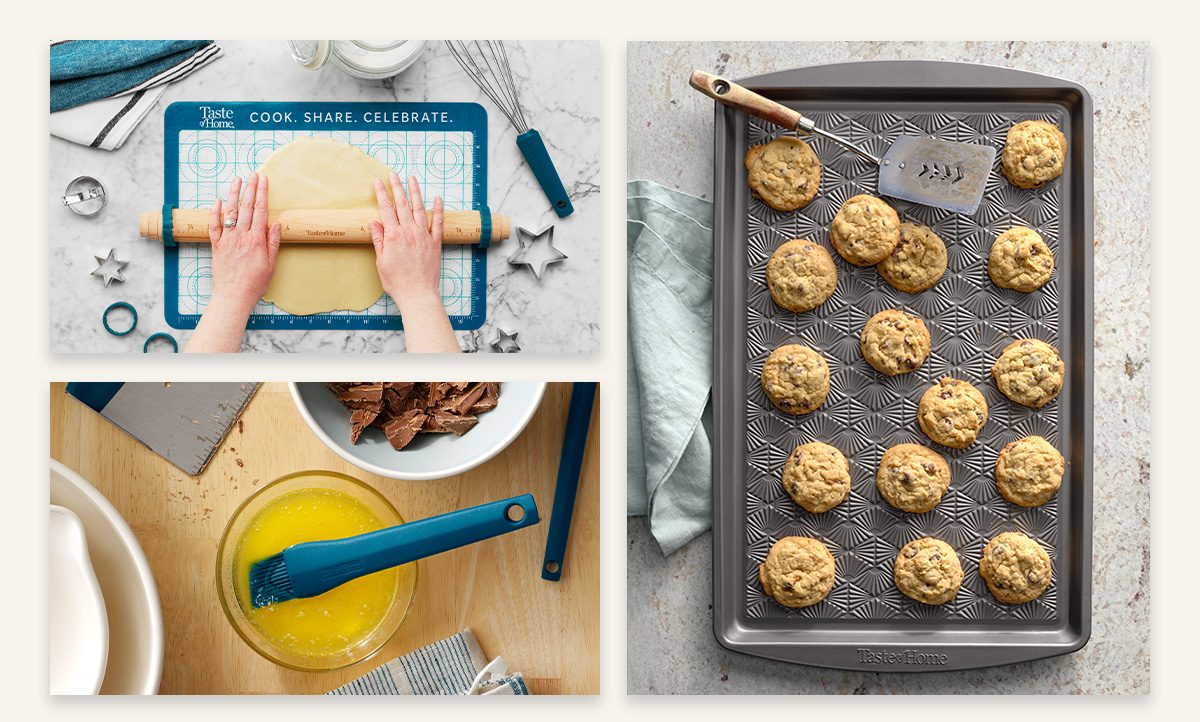 Enjoy easy baking, and even easier cleanup, with our 4-pc. Taste of Home Deluxe Baking Sheet Bundle! Curated by our Test Kitchen pros, this spectacular set includes a handy pastry mat, premium baking sheet and food-grade silicone utensils—all safe for dishwasher use. It's everything you need to mix, baste & bake your way to sweet success (and without much mess)!