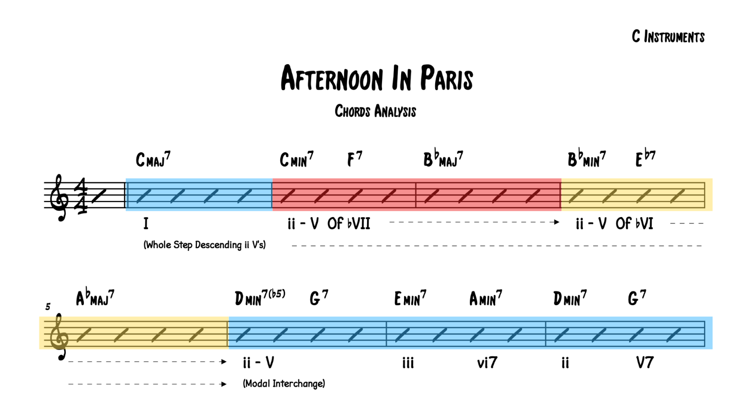Afternoon In Paris fits into a category of songs that I like to call "super jazz standards," meaning that it packs some really core lessons that translate to hundreds of others.