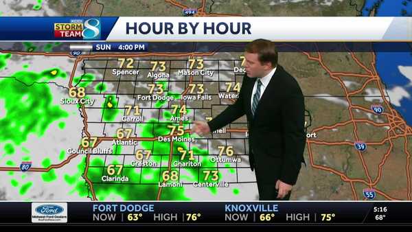 Partly cloudy. Showers developing this afternoon with a few spotty storms, especially for central and southwest Iowa. High 77F. Winds ESE at 5 to 10 mph.