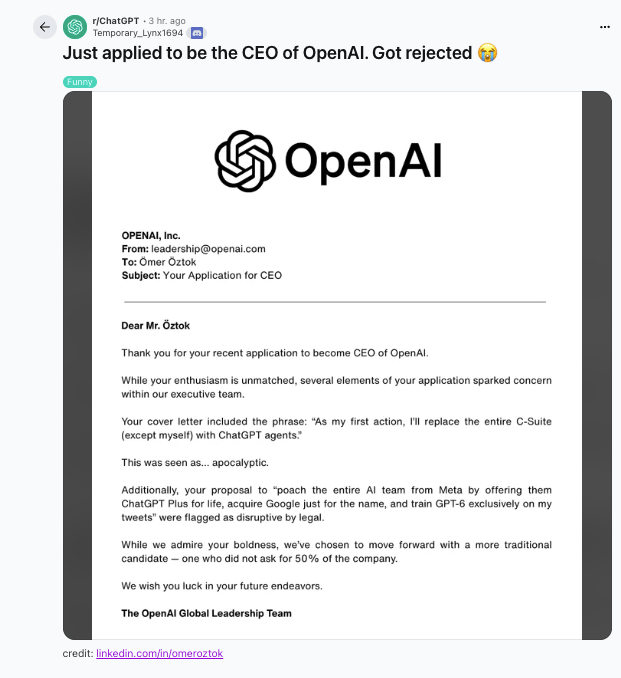 Someone allegedly just applied to be "CEO of OpenAI" and got spectacularly rejected. The (presumably) fake rejection letter is going viral on LinkedIn and Reddit and honestly, it's comedy gold. |