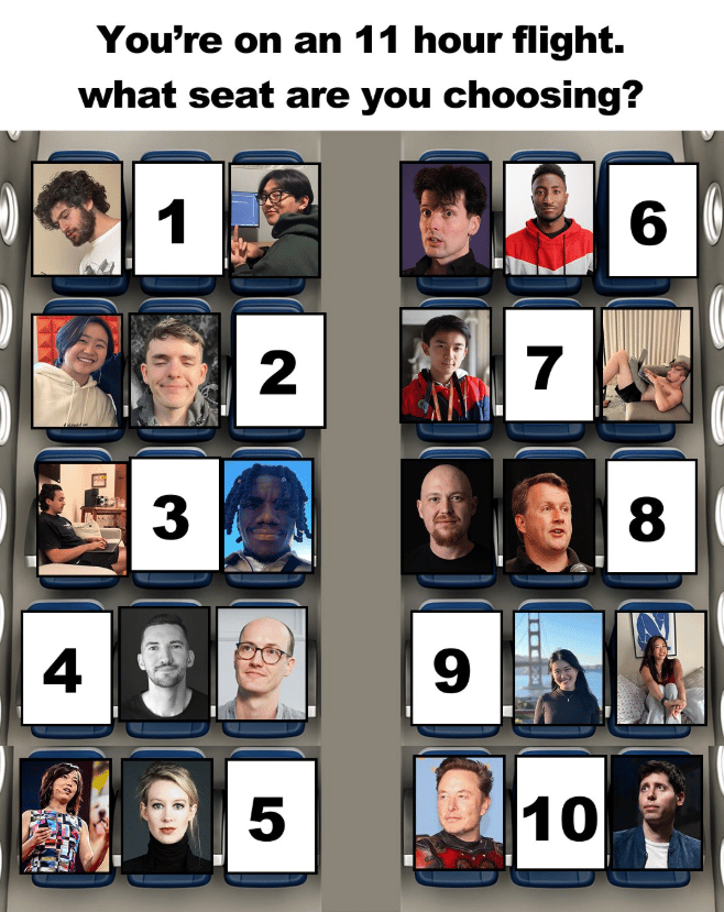 | IDK what's more fun… trying to pick where to sit on this plane full of influential Silicon Valley / AI people, or reading the comments from the actual "influential Silicon Valley / AI people" reacting to their seating arrangements and trying to renegotiate where they want to sit. |