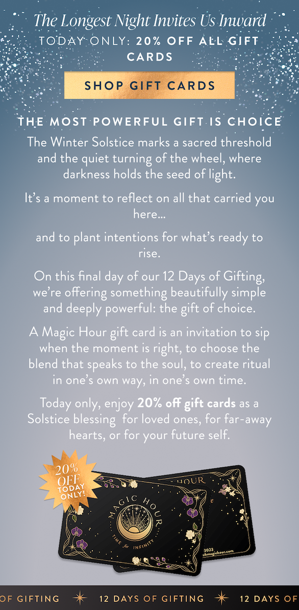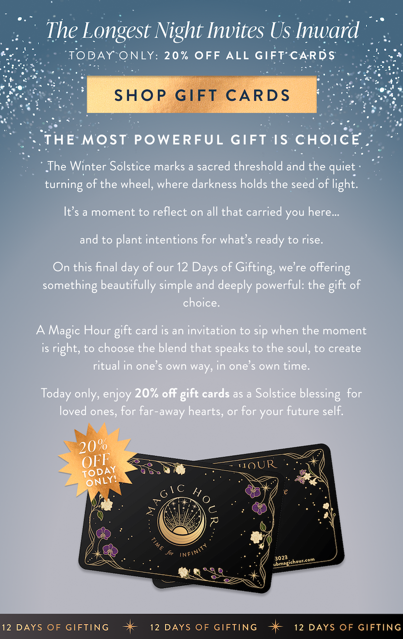 © MAGIC HOUR 2025 Email Sent to: ignoble.experiment@arconati.us No longer want to receive these emails? Manage Preferences . Magic Hour 406 Bryant Circle Suite O Ojai, California 93023 | | © MAGIC HOUR 2025 Email Sent to: ignoble.experiment@arconati.us No longer want to receive these emails? Manage Preferences .Magic Hour 406 Bryant Circle Suite O Ojai, California 93023 These statements have not been evaluated by the Food and Drug Administration. This product is not intended to diagnose, treat, cure, or prevent any disease. |