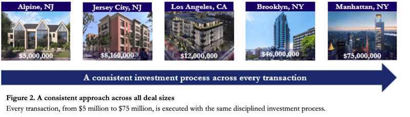 Leveraging long-standing proprietary relationships with real estate sponsors, other lenders and industry professionals, our team reviews an annual deal pipeline of $15 billion+. Through diligent underwriting, our investment process rejects 95%+ of these opportunities, ensuring only the top 3 – 4% is shared with investors. These direct relationships allow us to source attractive, off-market deal flow with repeat high-quality borrowers with a historical track record of strong performance.
