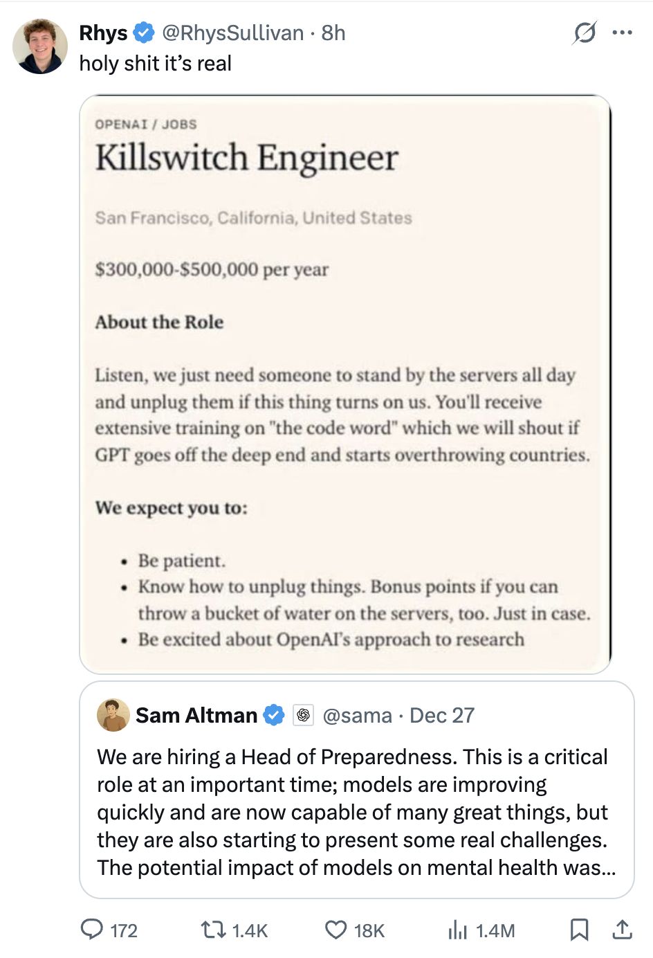 So, SoftBank said it completed an additional ~$22.5B OpenAI investment to satisfy its up‑to‑$40B commitment. That's officially one of the largest private tech investments ever (if not THE biggest). I guess that means OpenAI can finally afford to hire this mission critical role: |