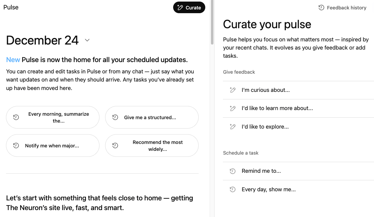 | If you have access to ChatGPT Pulse, you can now "curate" your pulse to focus on what matters to you, as well as schedule tasks to do for you. |