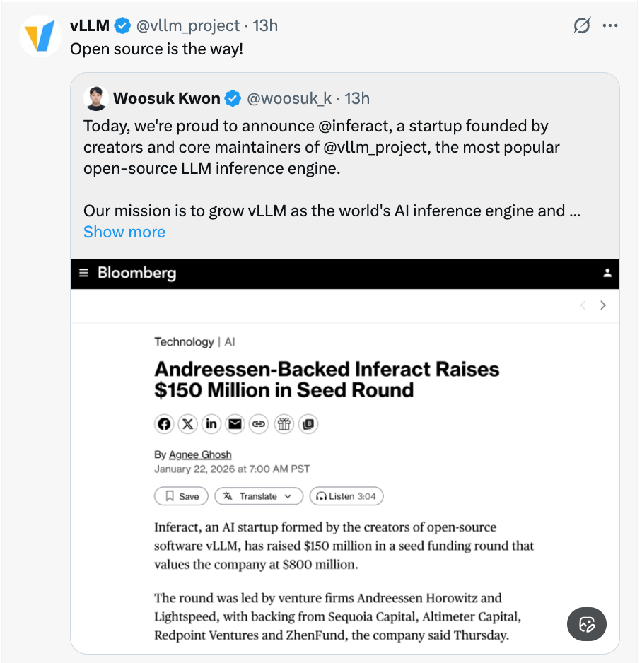 For you: If your company is evaluating AI tools, ask vendors about their inference infrastructure. Tools built on engines like vLLM will scale more cost-effectively than proprietary solutions that haven't solved this problem. The open-source advantage here is real… and now, venture-backed. |
