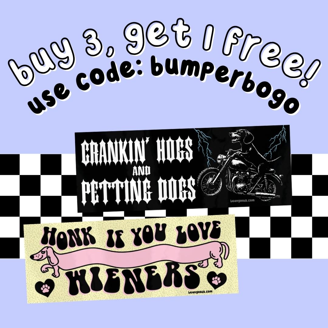 get ready to roll in sausage style - our new bumper stickers are here to make your ride EXTRA wienerful! 🚗✨ pawfect for every adventure, whether you're heading to the dog park or the drive-thru for a pup cup! | | buy 3 bumper stickers, get 1 FREE with code BUMPERBOGO! ⭐ stock is limited and they're already racing away, so rev up and grab yours before they're gone! | | | | |