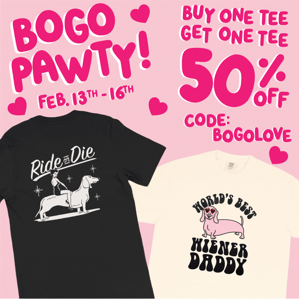hey fweens, our annual v-day weekend BOGO tee pawty is officially on 😍 buy one tee, get one 50% off! whether you're shopping for your boo, your bestie, or finally replacing that tee you've worn to death... now's the tiiiime to treat yo'self 💘 use code BOGOLOVE at checkout (this weekend only) | | like all good things, this pawty must come to an end! BOGO tees vanish when the clock strikes midnight on the 16th. don't get left in the doghouse! ⏰😱 | | | | |