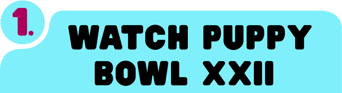 | | Watch Puppy Bowl XXII on Sunday, Feb. 8 at 2 p.m. ET, featuring more than 100 adoptable puppies from shelters across the country! What To Do: Watch it and prepare for cuteness
