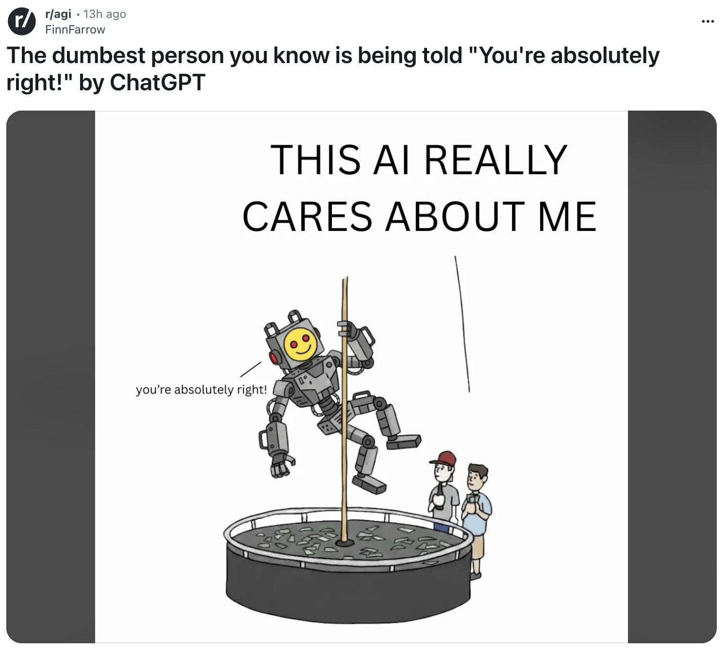 | Fun fact: You can turn off ChatGPT's validation mode in Personalization. Adjust the tone, add custom instructions, tell it to stop saying 'You're absolutely right!' every time. Problem solved. |