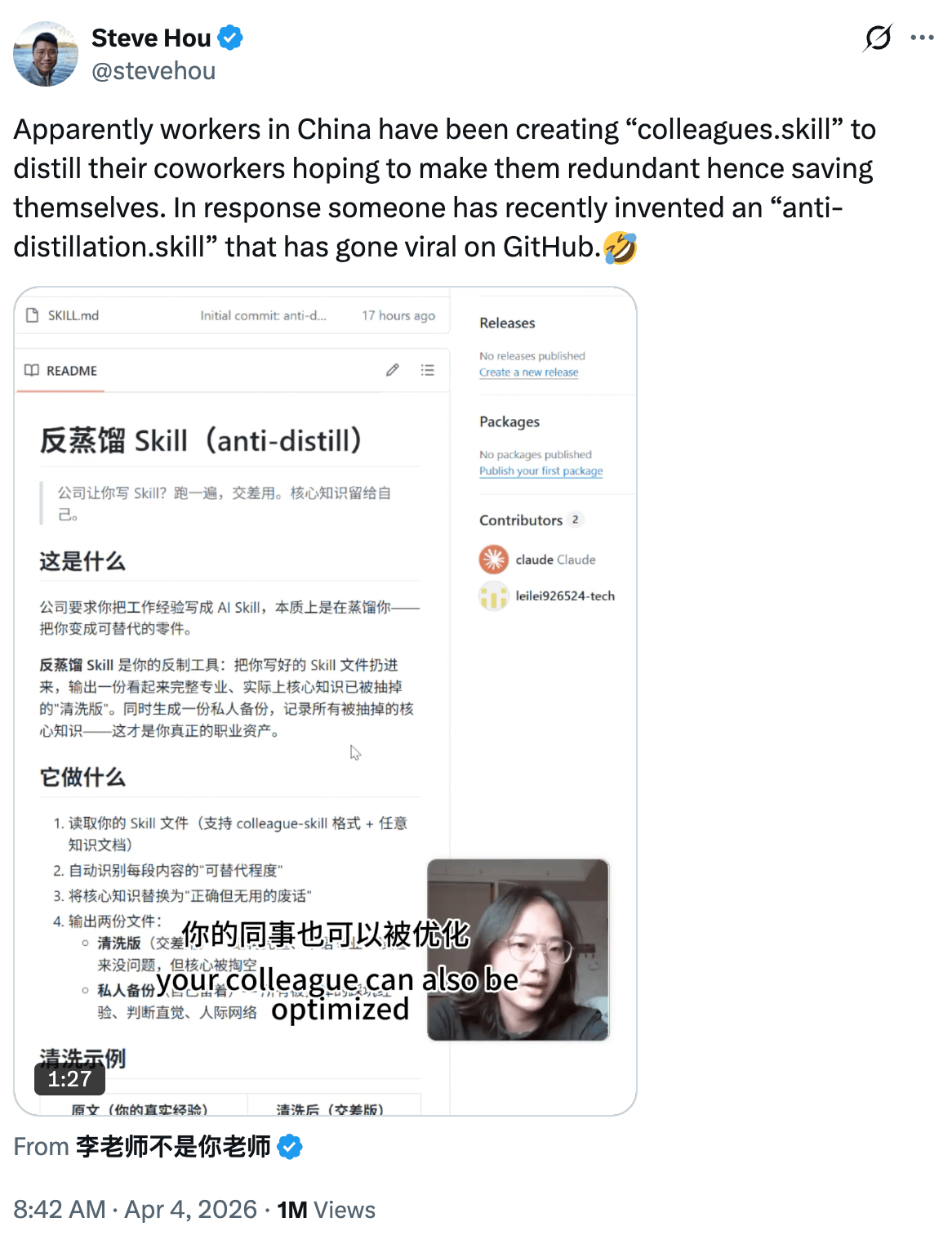 Chinese workers are out here creating "colleagues.skill" files to make their coworkers replaceable by AI. So someone built an "anti-distillation.skill" to fight back. It strips out your real knowledge before handing the file over. |