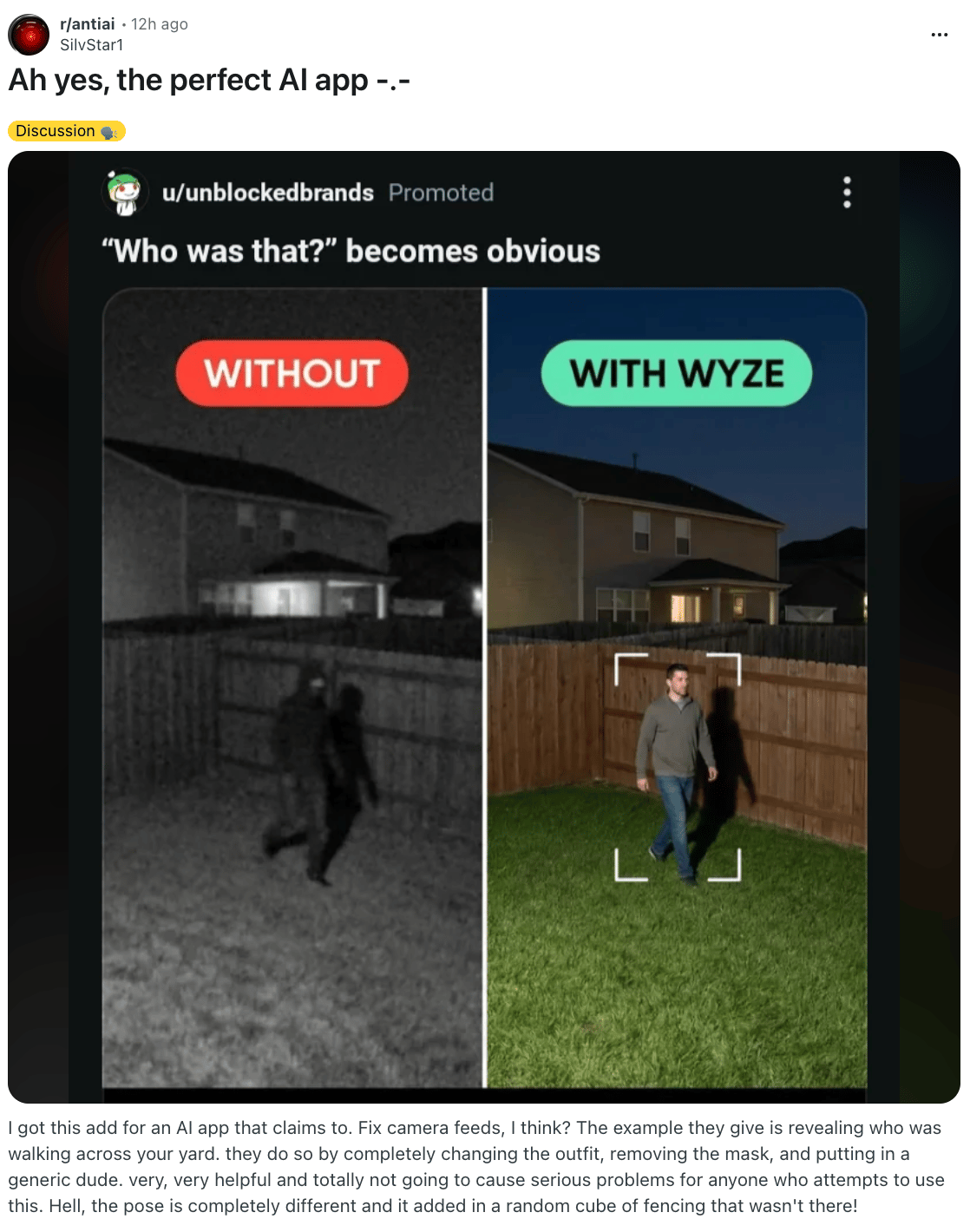 Your AI security cam caught an intruder! Oh, never mind. Thanks to AI, nothing looks sus. Cue Billie Eilish: “I'm the bad guy, duh.” 🤣 |